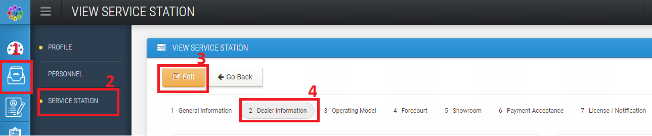 Please click here to login to your profile. Then from Profile menu (#1) on left menu bar click on “Service Station” sub menu (#2) and click on Edit (#3), then select section “2- Dealer Information” (#4)