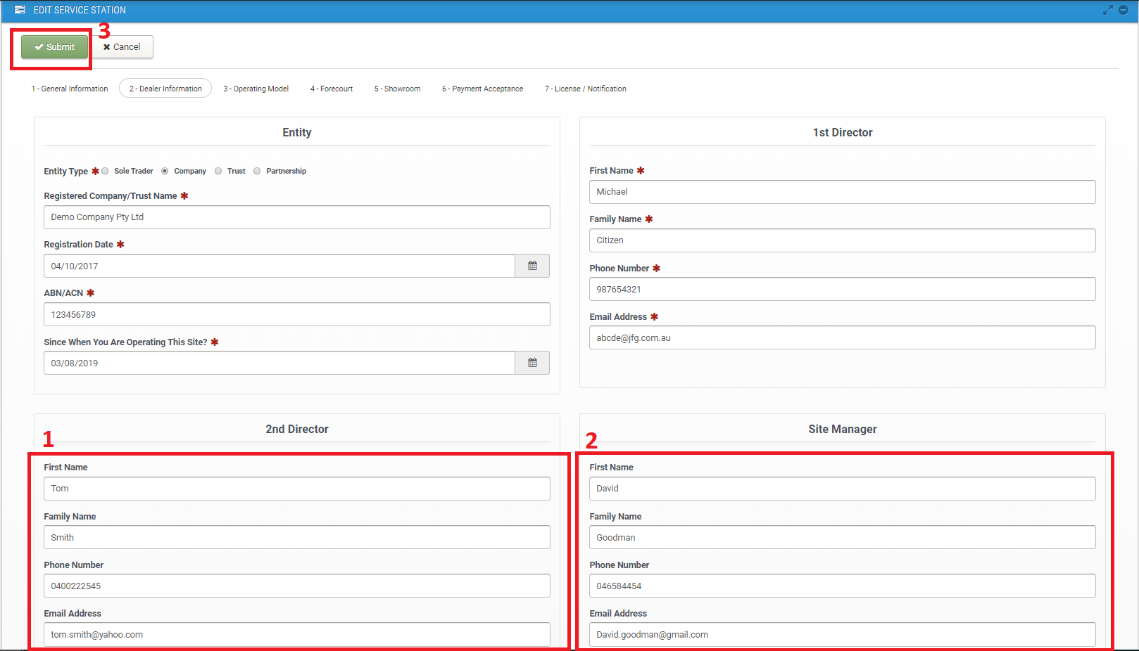 Then scroll down to get to “2nd Director” and “Site Manager” section and add or update your information and click on Submit button on top, we also recommend to check 1st director information and make sure every thing is up to date.